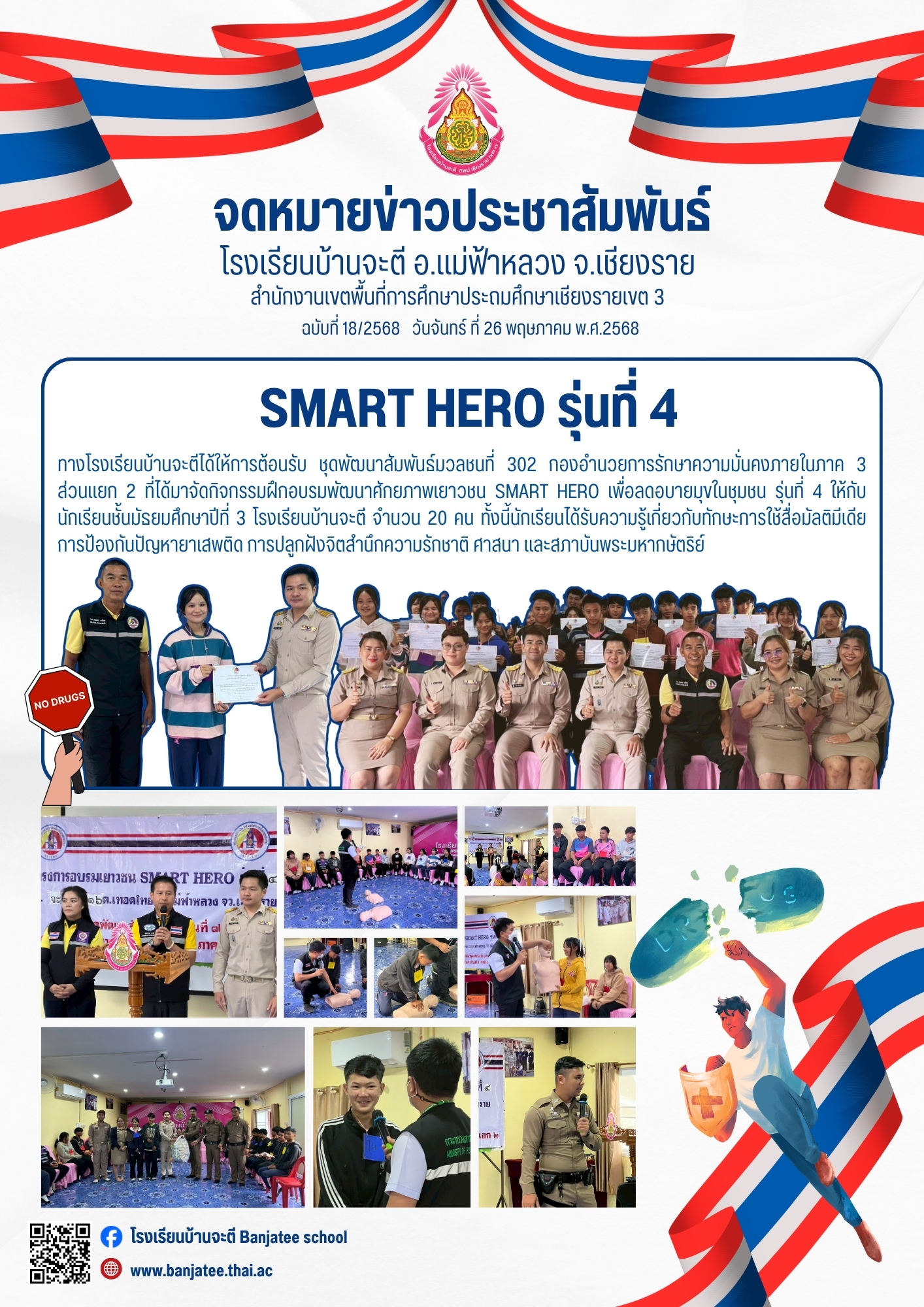 ชุดพัฒนาสัมพันธ์มวลชนที่ 302 กองอำนวยการรักษาความมั่นคงภายในภาค 3 ส่วนแยก 2 ที่ได้มาจัดกิจกรรมฝึกอบรมพัฒนาศักยภาพเยาวชน SMART HERO เพื่อลดอบายมุขในชุมชน รุ่นที่ 4 ให้กับนักเรียนชั้นมัธยมศึกษาปีที่ 3