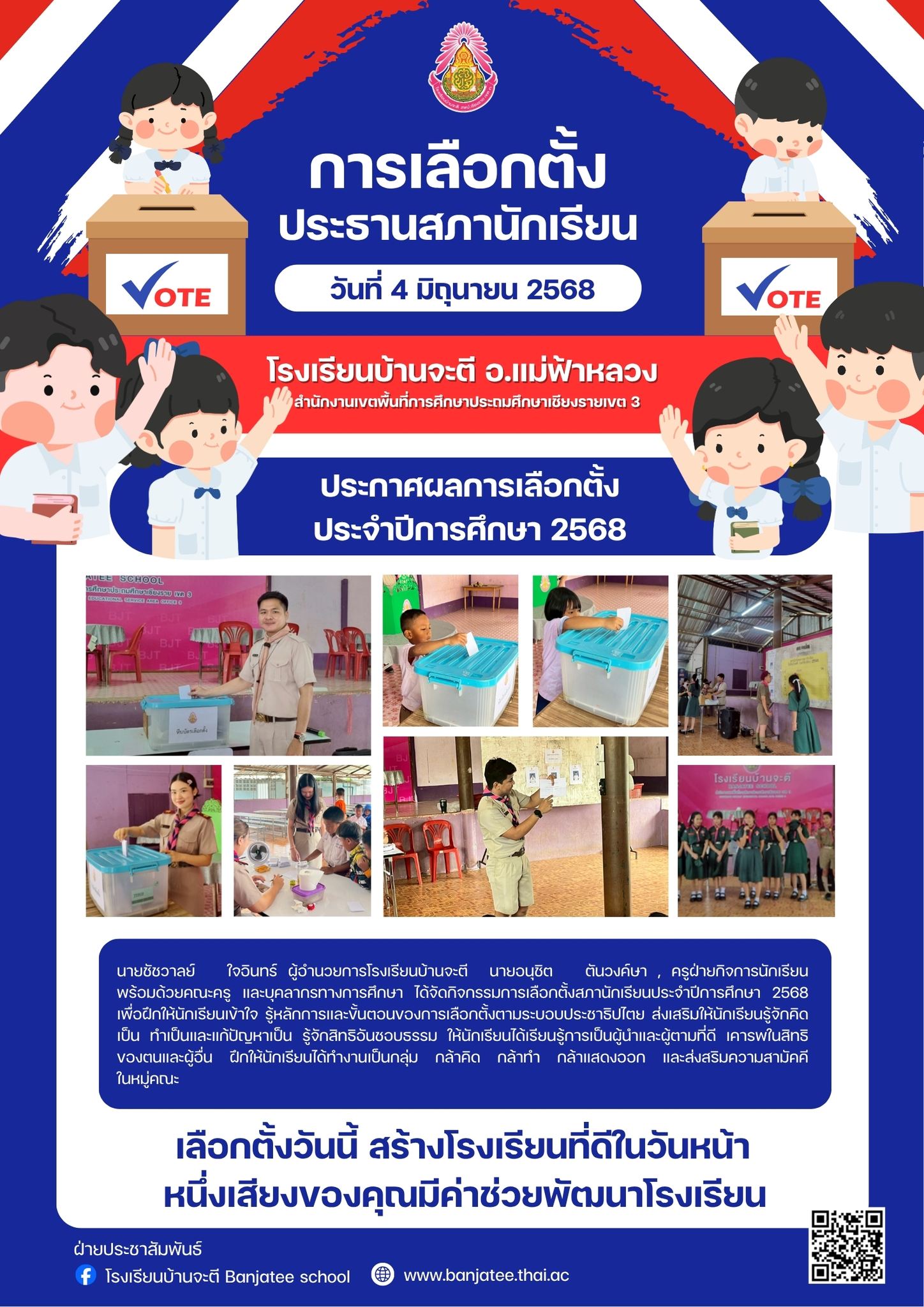 นายชัชวาลย์ ใจอินทร์ ผู้อำนวยการโรงเรียนบ้านจะตี นายอนุชิต ตันวงค์ษา , ครูฝ่ายกิจการนักเรียน พร้อมด้วยคณะครู และบุคลากรทางการศึกษา ได้จัดกิจกรรมการเลือกตั้งสภานักเรียนประจำปีการศึกษา 2568 เพื่อฝึกให้นักเรียนเข้าใจ รู้หลักการและขั้นตอนของการเลือกตั้งตามระบอบประชาธิปไตย ส่งเสริมให้นักเรียนรู้จักคิดเป็น ทำเป็นและแก้ปัญหาเป็น รู้จักสิทธิอันชอบธรรม ให้นักเรียนได้เรียนรู้การเป็นผู้นำและผู้ตามที่ดี เคารพในสิทธิของตนและผู้อื่น ฝึกให้นักเรียนได้ทำงานเป็นกลุ่ม กล้าคิด กล้าทำ กล้าแสดงออก และส่งสริมความสามัคคีในหมู่คณะ