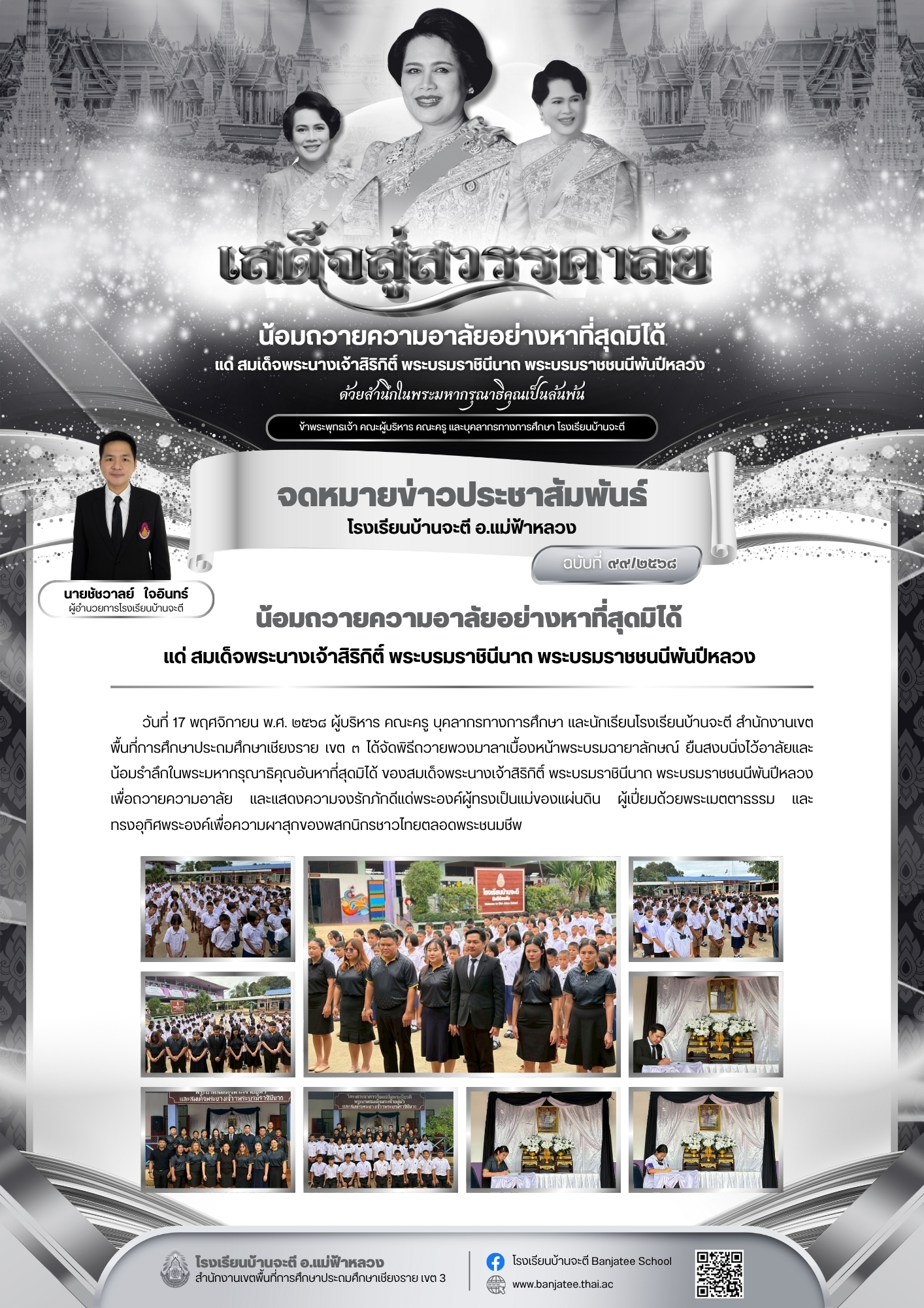 ผู้บริหาร คณะครู บุคลากรทางการศึกษา และนักเรียนโรงเรียนบ้านจะตี สำนักงานเขตพื้นที่การศึกษาประถมศึกษาเชียงราย เขต ๓ ได้จัดพิธีถวายพวงมาลาเบื้องหน้าพระบรมฉายาลักษณ์ ยืนสงบนิ่งไว้อาลัยและน้อมรำลึกในพระมหากรุณาธิคุณอันหาที่สุดมิได้ ของสมเด็จพระนางเจ้าสิริกิติ์ พระบรมราชินีนาถ พระบรมราชชนนีพันปีหลวง เพื่อถวายความอาลัย และแสดงความจงรักภักดีแด่พระองค์ผู้ทรงเป็นแม่ของแผ่นดิน ผู้เปี่ยมด้วยพระเมตตาธรรม และ ทรงอุทิศพระองค์เพื่อความผาสุกของพสกนิกรชาวไทยตลอดพระชนมชีพ